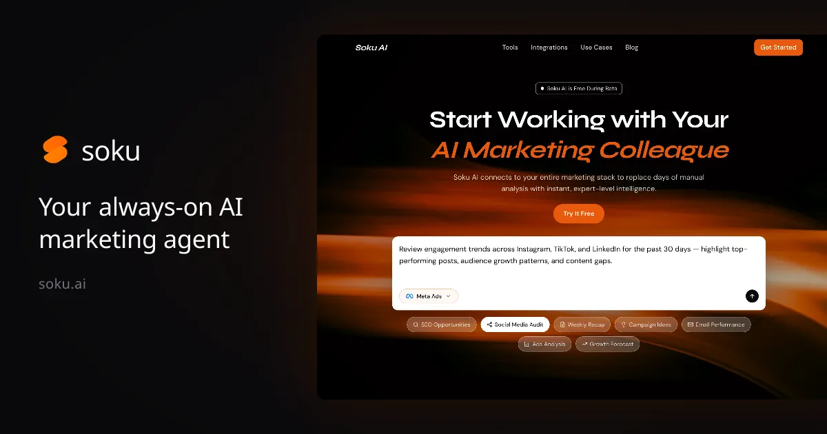 Get ListedSoku AI is an AI-powered marketing agent that connects to your entire marketing stack to automate campaign analytics, SEO, social media, and competitive analysis. It replaces days of manual analysis with instant, expert-level intelligence. Key features include cross-channel performance analysis, root-cause investigation, anomaly detection, and action plan generation. Soku AI integrates with platforms like Meta Ads, Google Ads, TikTok, GA4, Shopify, Semrush, HubSpot, and more. It is designed for performance marketers, SEO specialists, social media managers, and growth leads. Currently free during beta, Soku AI helps teams move from fragmented data to unified insights and actionable next steps in minutes.